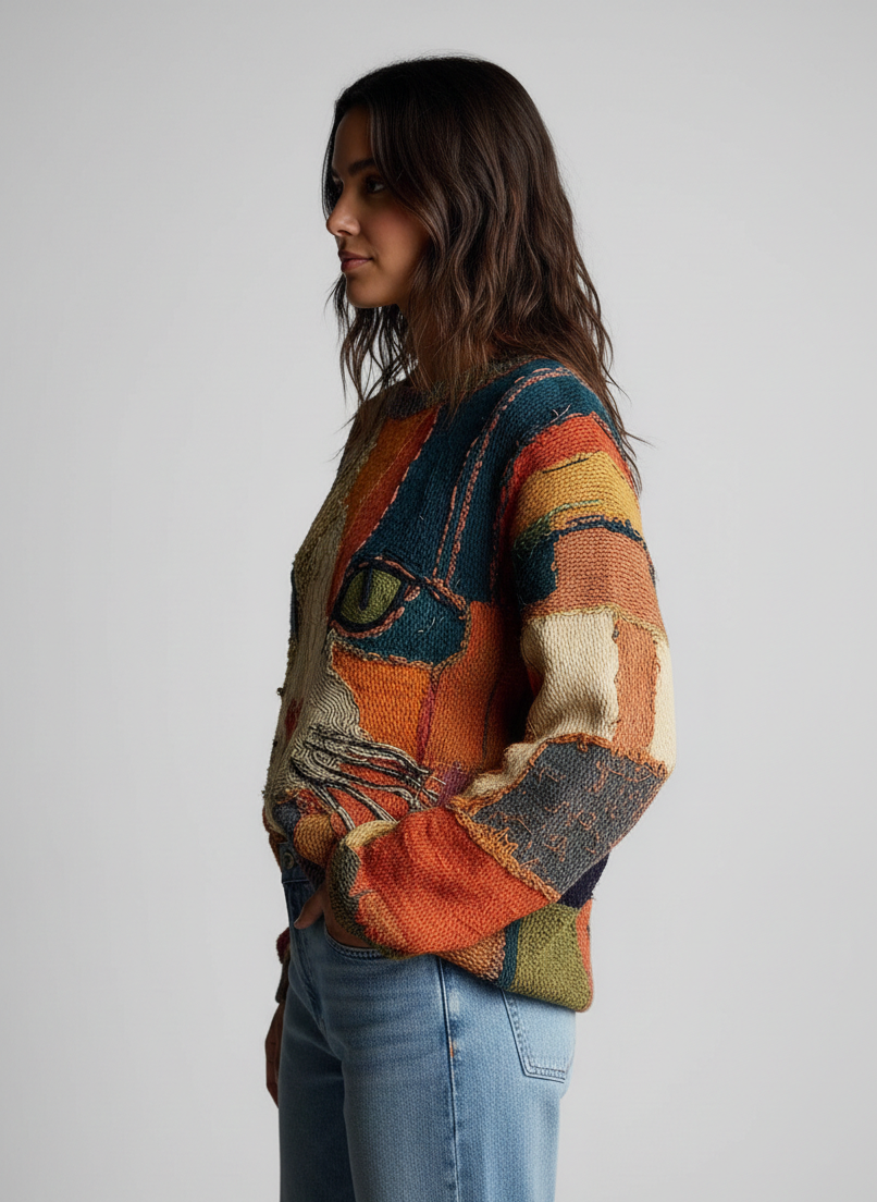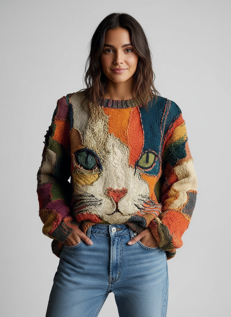 ✔︎ Diseño artístico único – Cara de gato en patchwork, ideal para un look creativo y original.