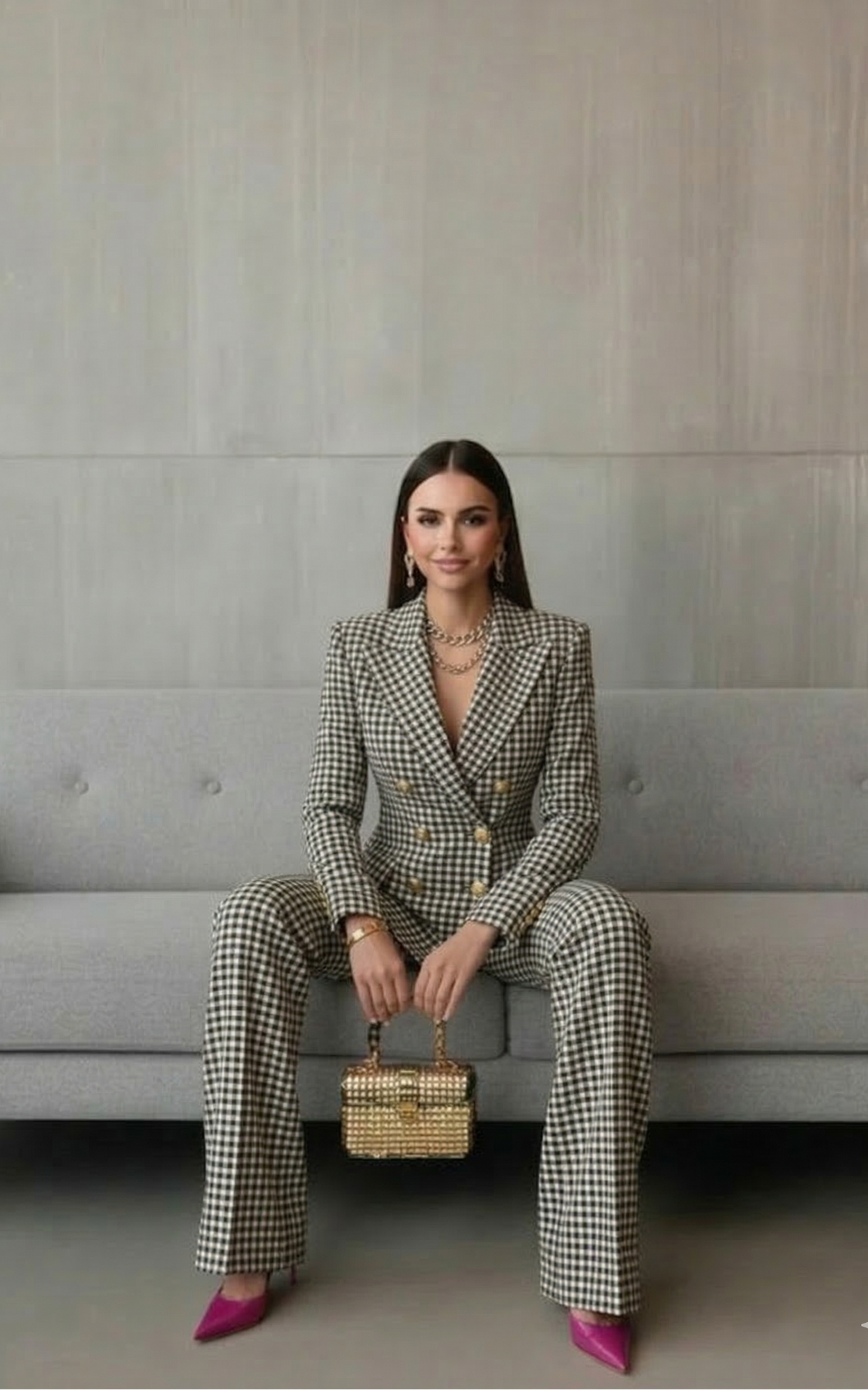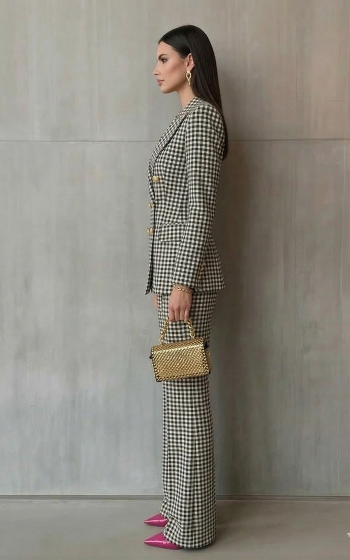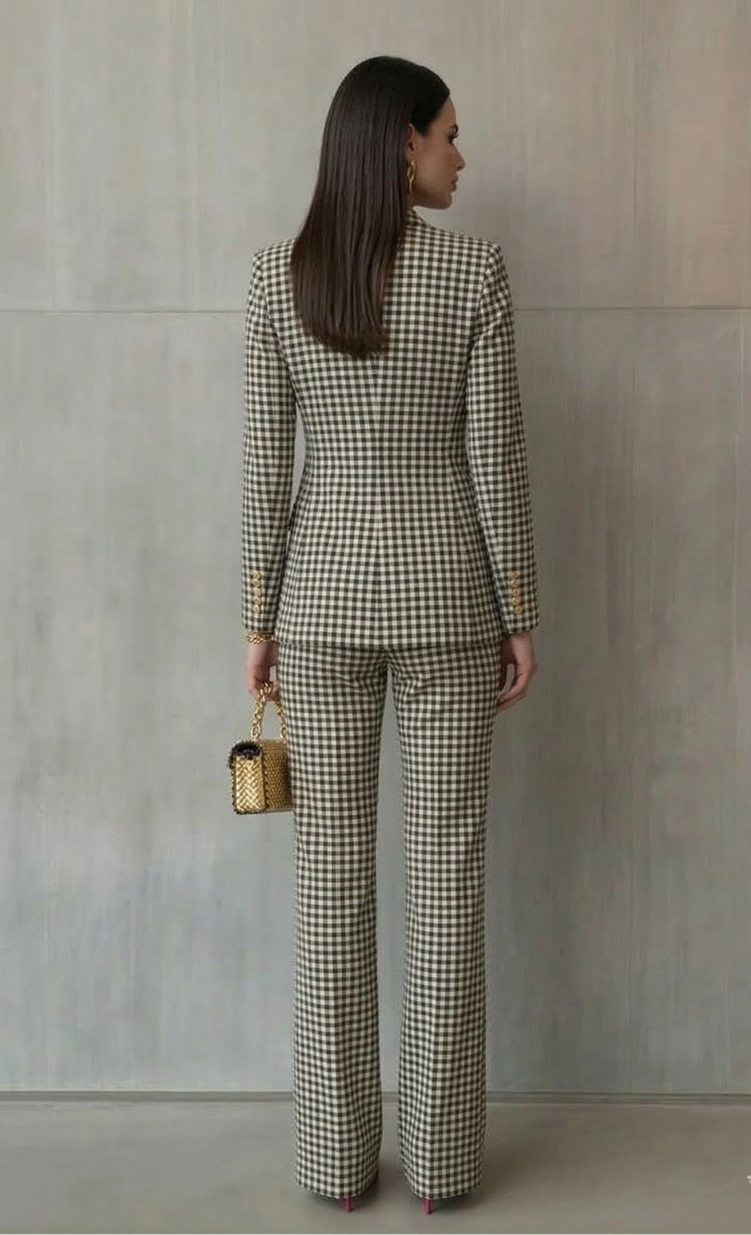 Silueta Esculpida: Su chaqueta de doble botonadura y pantalones a juego crean una línea elegante que favorece y estiliza la figura al instante.