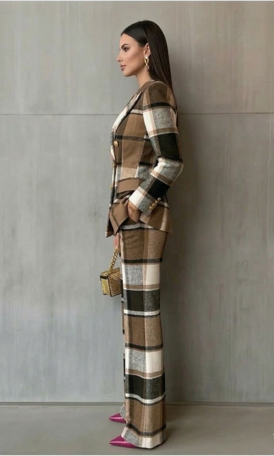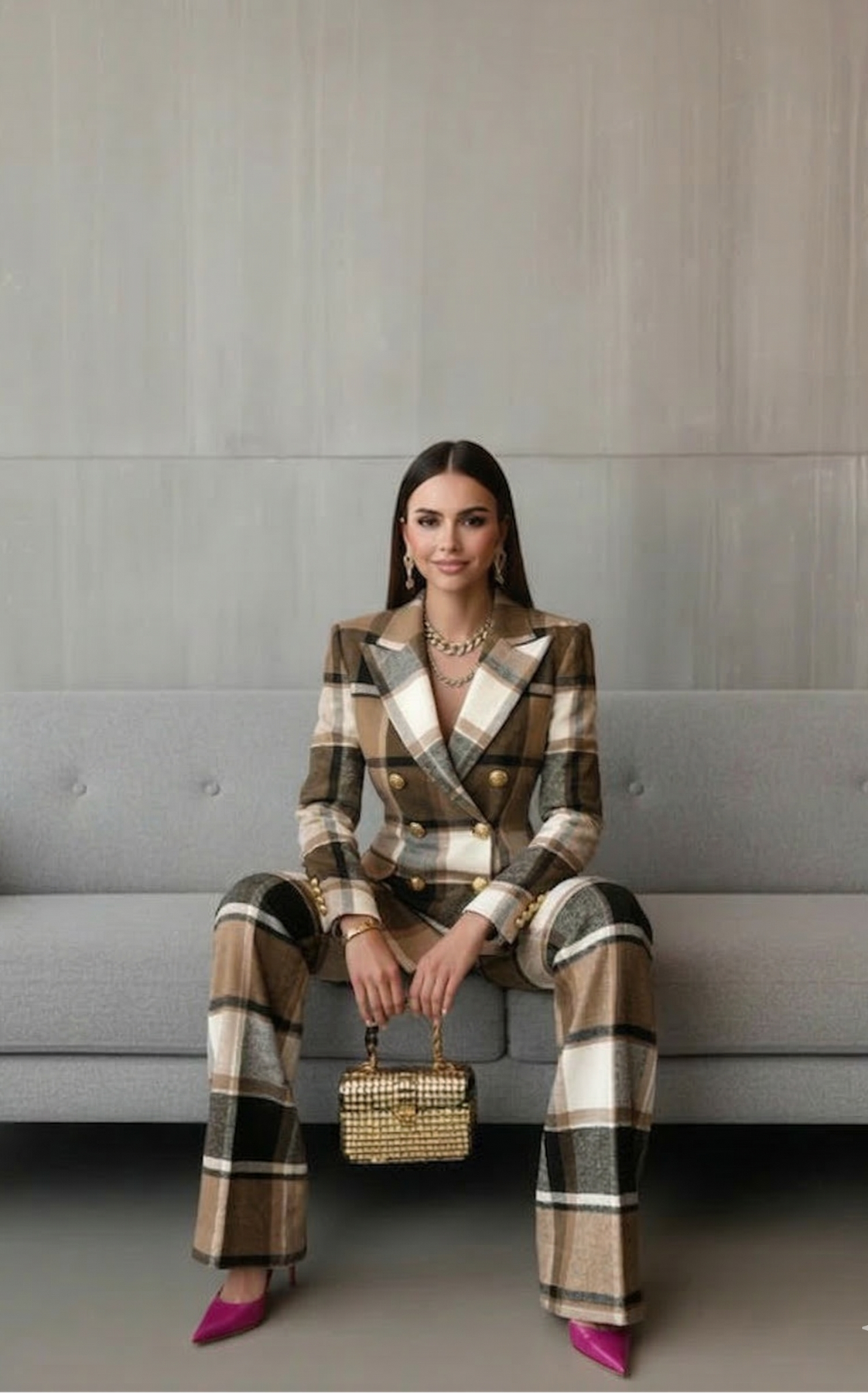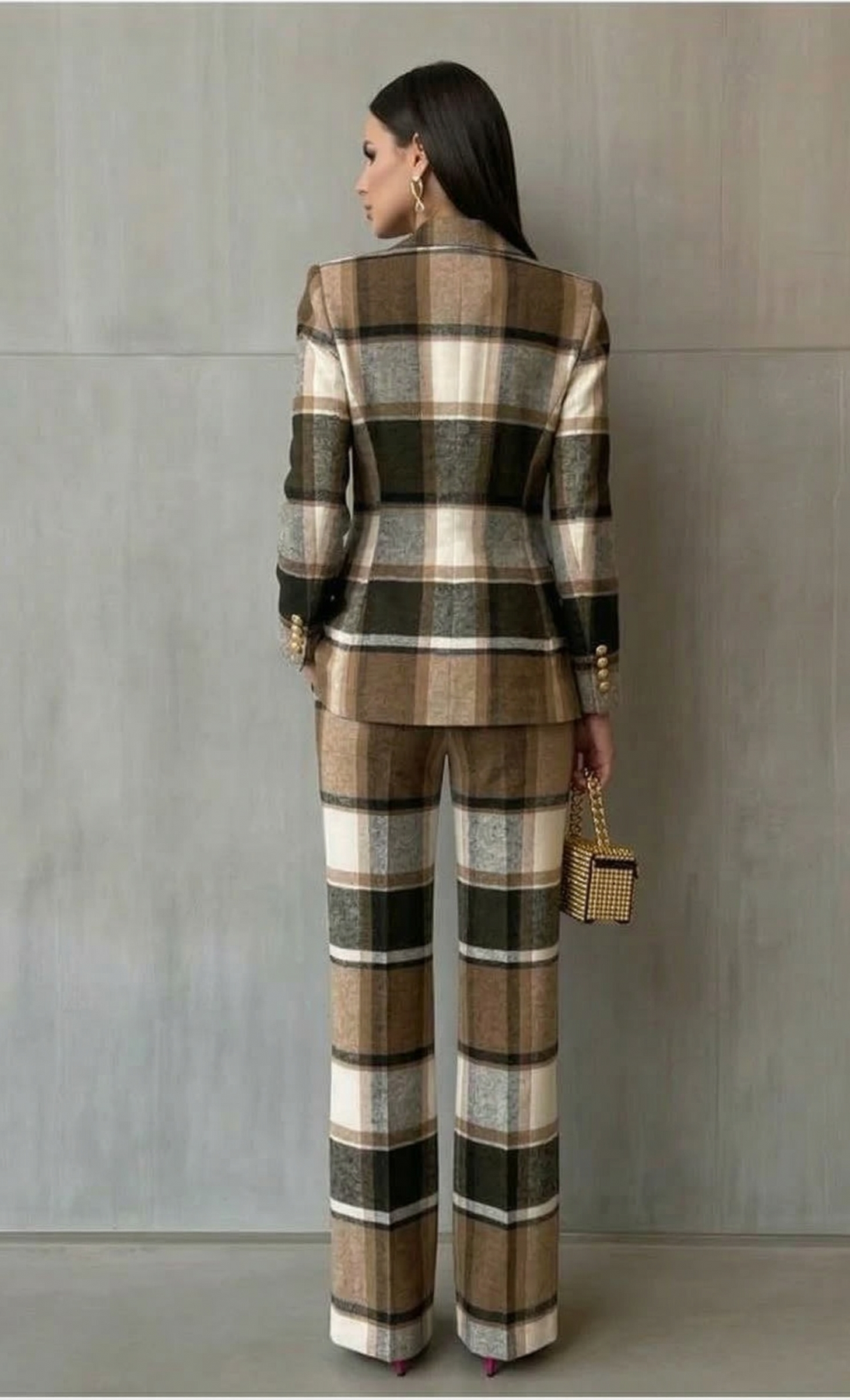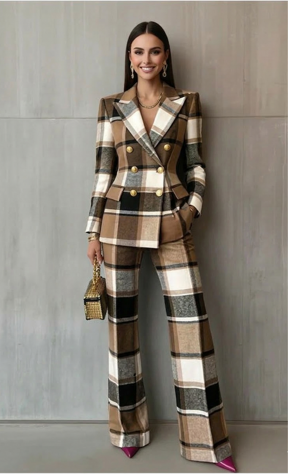 • Silueta Esculpida: Su chaqueta de doble botonadura y pantalones a juego crean una línea elegante que favorece y estiliza la figura al instante.